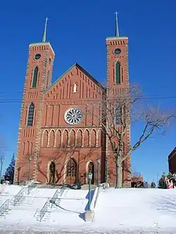 It was built in 1870–75 in a French Gothic/High Victorian Gothic style. It is rectangular, 60 by 130 feet (18 m × 40 m) in plan, with two square 100 feet (30 m) tall towers. It served a community of French Catholic immigrants who left eastern France in 1826 and settled here. A brick church was built by 1838, which was demolished in 1869 to make room for the present church which was completed in 1875. It was designed by parish priest Father Louis Hoffer reportedly after the design of a small village cathedral in France. Its interior was designed by Cleveland architect Frank Walsh.[2]