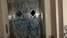 The main elevator, covered in graffiti