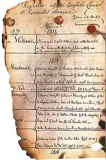 The oldest document we have is the Church Register for 1814, which records the death of a British prisoner of war, Brecon Williams, "at midday of the 7th February at the hospital in this town". The entries for 1815 refer to relatives of military personnel, mainly from His Britannic Majesties 71st Regiment of Foot, which became The Highland Light Infantry, and formed part of the ‘army of occupation’ camped near to Versailles after the Battle of Waterloo. This register shows that the church has no name and is referred to both as the ‘English Church at Versailles’ and the ‘British Episcopal Church Versailles – Seine et Oise’.It is not clear how an English Church continued to operate prior to 1815, during the period of the Napoleonic Wars. Perhaps it had diplomatic immunity?[2]