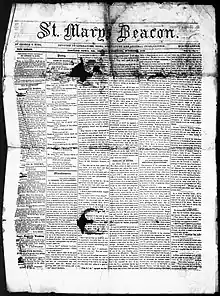 The St. Mary's Beacon was a weekly newspaper published from December 13, 1839, to June 10, 1983, in Leonardtown, Maryland, U.S.[1] Its headquarters was originally located on Washington Street in Leonardtown, a building which was formerly the Old Town Tavern.[2]