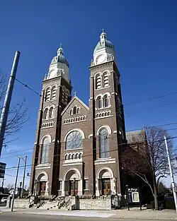 The current St. Mary's Church is a Romanesque Revival structure built in a mix of brick and stone. Constructed according to a design by John B. Vermont,[5] the design features two massive clock towers on the three-bay facade. Three large doorways piece the facade at the top of a staircase, with occasional large windows and numerous pairs of narrower windows on higher levels. Each window is topped with a dormered dome above the clock.[6] Built at a cost of $125,000 (or $3240741 in 2013 dollars),[2]: 359 the church is a landmark because of the twin towers; during World War II, Army aviators used it as a waypoint when navigating to the runways at Wright Field.[6]