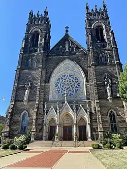 Built primarily of sandstone,[1] St. Mary's is a high Gothic Revival structure with a facade of two nearly identical towers and a Latin cross floor plan. The entire building measures 185 feet (56 m) from north to south and 85 feet (26 m) on the sides.[3] Sculptures are placed in small alcoves on the second stories of the towers and at the peak of the front gable, while windows and belfries occupy the higher stories of the towers. The main entrance comprises three adjacent portals underneath a large rose window at the center of the facade. Both the buttresses and the corners of the towers rise to decorative finials, while a large cross crowns the front gable.[5]
