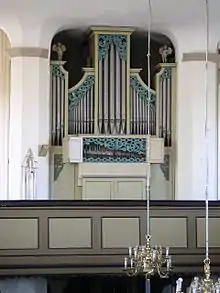 The pipe organ on the west gallery is one of the oldest and most valuable in the Stade County dating to the 16th century.[31] It was built by Hans Scherer the Elder and Antonius Wilde for Stade's St. Nicholas' Church between 1587 and 1590.[31] In the years 1609 and 1667 to 1669 not known organ builders repaired the instrument most likely also altering disposition and technical details.[40] In 1677 Arp Schnitger rebuilt the organ on the occasion of a general reshape of the interior of St. Nicholas, applying a new case and adding more voices.[40] He employed 151 pounds of lead and received a salary of Hamburg mark 200.[31][40] In 1709 Schnitger's competitor Otto Diedrich Richborn repaired the organ, likely on behalf of the former.[40]