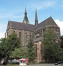 St. Mary's Church, on Ziegenmarkt, is a large Brick Gothic church. Built in the 13th century, it was enlarged and modified at the end of the 14th century into the present basilica. The first reference to a church on this site is in 1232, which is thought to be the predecessor of the current building. The triple-nave cross-shaped basilica is in Brick Gothic, a building style typical of the Hanseatic port cities of northern Germany. The huge tower with a baroque lantern at the top was not completed until the end of the 18th century.