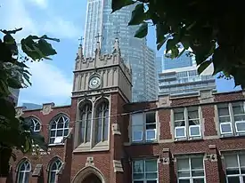 St. Michael's Choir School is located next to St. Michael's Cathedral Basilica and operates out of four buildings at 56, 66, 67 and 69 Bond Street. In 2016, the school's secondary school building, located at 69 Bond Street, was rated as in need of "critical" repairs and had the worst-performing score among Toronto Catholic District School Board secondary schools on the Ontario Ministry of Education's Facility Condition Index.[102] In 2018, the Ministry of Education announced it would spend $11.2 million CAD[103][104][105] to construct a new consolidated school building at 67 Bond Street designed by KPMB Architects.[106][107][108] In 2022, KPMB Architects, the Archdiocese of Toronto, and the Toronto Catholic District School Board submitted a new development plan to the City of Toronto for a revised six-storey school design that incorporates and restores the historic Gothic revival-style façade at 66 Bond Street.[109][110]