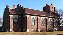 It is a rectangular, one-story brick church with a composite shingled gable roof, built upon a concrete foundation. It has a central entrance under a square bell tower. A gothic window is "above the front doors, along with a 'blind roundel'. The front facade contains engaged buttresses with concrete caps on either side of the door, which provide structural support to the tower. The bell tower also contains gothic shaped vents with concrete caps. The inscription on the bell when translated reads "Yours was not the busy city's pounding, you were cast for my own village small." The front doors are original. Each side of the church contains four gothic arched windows with concrete caps, and all are found between engaged buttresses that also feature concrete caps."[2]