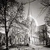 In 1970, the original Gothic church structure was destroyed by fire as a result of arson.[1] The vestry voted to remain in the same location and carry on an active ministry within the community. The Parish Hall, which was left standing behind the footprint of the old church, was also transformed into the simple, modern worship space parishioners use today. The rest of the building became a center for community meetings and various recovery groups. St. Thomas' leaders later decided to convert the area where the old church building stood into a neighborhood park.