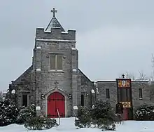 In 1841, the Episcopal Diocese of Virginia formed what was named the Holston Parish, the bounds of which included all of Washington County.[2] Parishioners met at the Washington County Courthouse as they organized themselves into a congregation which they named for Saint Thomas the Apostle.[2] The parish gonfalon depicting the symbols of Saint Thomas, the carpenter's square and the spear, stands beside the altar.[3]