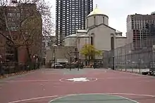 Basketball courts on the west side of park with St. Vartan Armenian Cathedral in the background