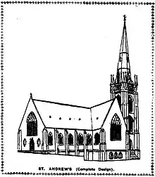 The first Anglican church in South Brisbane, St Thomas', had been built c.1855 on the corner of Grey and Melbourne Streets. The construction of St Andrew's reflected the growing population of the area and the general move of residential and public buildings up the hill away from the flood-prone area of first settlement. Flamboyant Italian architect Andrea Stombuco was commissioned to design St Andrew's, which was to be a substantial structure in stone. Stombuco, who had designed a number of ecclesiastical buildings for the Catholic Church, including St Joseph's Christian Brothers' College on Gregory Terrace (1875–1876), Rathbawn (a house built for Roman Catholic Bishop of Brisbane, James Quinn) at Nudgee (1875–1878) and St Mary's Roman Catholic Presbytery in Ipswich (1875), envisaged a grand structure for St Andrew's, with a prominent tower and spire.[1]