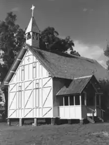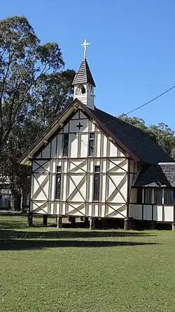 The church is a simple rectilinear form, with the chancel to eastern end and the porch to the south of the western end. The addition housing the vestry is to the south-east corner. The wall framing of studs, noggings and bracing is exposed to the exterior of the building, and purposefully arranged as a decorative element which is further emphasised by its contrasting colour. The wall cladding to the interior of the framing is pit-sawn planks of cypress pine, some 250 millimetres (9.8 in) wide, laid horizontally. The roof is steeply pitched with gable ends, and a timber bell-cote with spire at the western end. The roof is clad in hand-split hardwood shingles. The entry door from the south porch is a boarded and ledged door with a lancet head, and still furnishing its original bolt and rimlock. Inside, the nave has a special quality of light created by a continuous opening between the top of the walls and the roof framing, to the sides and the gable ends. The tall, narrow windows hand painted with a stipple pattern also contribute to this light. These windows have trefoil heads applied to the outside, giving them a Gothic-like shadow internally. They open by sliding along tracks to the inside of the wall. The floor is of wide raw cypress pine boards, which are hand-scrubbed clean to retain their bleached appearance. The exposed roof framing and trusses have been stained. All the major members are stop chamfered. The trusses feature twisted vertical tie rods. The chancel arch, also of lancet form, is lined with beaded board.[1]