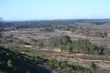 St Catherine's Hill, together with Ramsdown and Blackwater hills, comprise a 3-mile (4.8 km) long ridge running roughly north to south between the Avon and Stour valleys just to the north-west of where the rivers converge in the borough of Christchurch in Dorset.[11][30][31] The top of this ridge is almost a level plateau, 45 metres (148 ft) above sea-level at the southern end and 49 metres (161 ft) in the north. St Catherine's hill, in the south, forms the highest point of this three hill chain at 53 metres (174 ft) and has some of the steepest slopes at 1:1 or 45°.[30][31] The 400 acres (160 ha) site is a mixture of woodland and heath and is part of a larger Site of Special Scientific Interest (SSSI). The eastern slopes and foot of the hill, an area referred to as the Town Common, is almost exclusively open heath and as such has also been designated a Special Protection Area (SPA) and Special Area of Conservation (SAC).[18][31]
