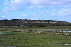 During World War I a complete set of trenches were built on the hill including firing, communication and second line trenches, with observation and machine gun posts, dressing stations, latrines, mine shafts, and various rooms and strong points. Soldiers were trained in trench warfare and construction there prior to being sent to Flanders.[21] The area was used during the Second World War, for tank driving practice.[20] Anti-aircraft guns were positioned there to protect the aerodrome at Hurn.[21] After the war, the Royal Observer Corps built a nuclear bunker into the hill.[22] It was designed so that a three-man team could survive within for up to three weeks whilst observing the effects of a nuclear blast. After closing in 1991 the ROC Post was filled in, with the only remaining feature being a single disused telegraph pole 15 yards (14 m) away.[22][23]