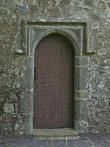 The church is built from rubble masonry with very large boulder quoins; the roof is made from slate with stone copings.[3] The main part of the church is 45 feet 6 inches long by 15 feet 3 inches wide (13.87 by 4.65 m); the annexe at the west end measures 20 feet 6 inches by 15 feet 6 inches (6.25 by 4.72 m).[9] At the west end of the roof of the nave, there is a bellcote with a single bell decorated with three bull heads, dated 1661; at the east end, there is a cross. There is no structural division between the nave and the chancel. The annexe at the west end is smaller and lower in height than the main building, and was built in line with it. It may have been built for use as a schoolroom.[3][10] It has a 16th-century doorway at the west end, converted into a window in the 19th century, and a modern door at the east end, as well as an 18th-century fireplace. The main entrance into the church is on the north side of the nave, dating from the late 15th century. The doorway is pointed, in a square frame.[3]