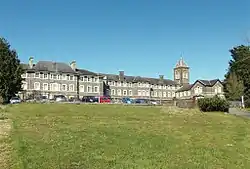 The hospital opened as the Carmarthenshire, Cardigan and Pembrokeshire County Asylum in 1865, with room for 212 patients.[1] The architect was David Brandon.[2] His substantial three-storey buildings were designed in an Italianate style and included men's and women's wards, day rooms, offices, a grand dining hall, and a chapel. There were workshops and exercise yards for patients. The asylum had its own water towers and a gas works.[1] In 1870, and between 1878 and 1880, additional wings were added and early examples of cavity walling to the ventilation towers.[2]