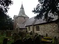 The church is built of Old Red Sandstone rubble.[1] It comprises a nave with west tower, chancel, aisle and porch.[1] The architectural historian John Newman considered the "broad and squat" tower the most memorable feature.[2]