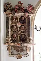 The Newcourt Family monument (see left) is the oldest wall memorial in the church dating to 1645 and is dedicated to Tobie Newcourt. It show Tobie Newcourt his son William and his four sons: John, William, Tobie and another John. The two female heads represent the wives of Tobie and his son.[10]