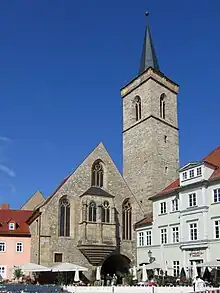 St Giles' Church (German: Ägidienkirche, also St. Ägidii[1]) in the historical centre of the city of Erfurt in Thuringia, Germany, forms the eastern entrance from Wenigemarkt (Minor Market) to the Krämerbrücke (Merchants' Bridge) with its archway. The single-nave Gothic church building[2] is one of the former two bridgehead churches. At the western end stood the Benediktikirche (St Benedict's Church) since the 11th century, which was demolished in 1890[3] and is now only remembered by the name of Benediktsplatz (St Benedict's Square).