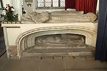 The church is noted for the founder's cadaver tomb. John Barton was a prosperous wool merchant who died in 1491. His wealth accumulated from sheep was acknowledged in stone and stained-glass in his now-gone home 'I thank God and ever shall, It is the shepe that hath payed for all' (sic) he founded St. Giles' church and built his tomb during his lifetime with his memento mori below. At his feet is his rebus - a barrel (tun) with a bar across it for 'Barton'.