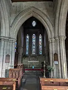 The church is small, measuring 44 feet (13 m) by 32.5 feet (9.9 m). The nave is two bays long, and the chancel a single bay, separated by a chancel arch. There are north and south aisles running the full length of the church. The east window is of three lancets, with a deeply carved surround, while the main west window is a single large lancet. In both aisles are an aumbry and piscina and original windows; the west window of the north aisle has some ancient stained glass. The whole building is covered by a single, pitched, roof.[1][3]