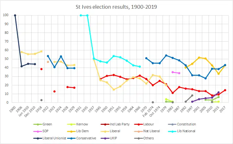 After the boundary revisions introduced at the general election of 1918, which brought in most of the villages on the Lizard Peninsula (though not Helston), the constituency was simply called Cornwall, St Ives. It underwent further boundary changes in 1950, bringing Helston into the constituency, and in 1983, when it was extended to include all of the Penwith local government district.