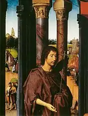 Unlike his predecessors Jan van Eyck and Rogier van der Weyden, who typical painted exterior wings in grisaille, Memling presents the saints in a realistic manner. Although the donors in van Eyck's Ghent Altarpiece and van der Weyden's Beaune Altarpiece are also painted realistically, they are placed within architectural niches separate from the adjacent statue-like grisaille saints. Memling breaks with that tradition in these exterior panels, but the subdued palette he uses retains some sense of grisaille.[14] The donors are dressed in their Augustinian habits; the two men in stark black and the two women in white on black. The saints are dressed in monochromatic clothing. St James wears a light blue cloak and St Anthony's is grey. St Agnes is dressed in drab green and St Clare is also in a dark habit.[13] Although the figures seem to be in two niches, they are enclosed in a single shallow space, with stone walls behind, trefoil arches above, and two columns adorning the outermost edges. Where the wings open is a single column which has the appearance of two separate columns.[13]