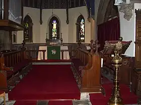 The entrance porch beneath the tower contains a replica of the Alnmouth Cross, the cross was found on Church Hill in the 1780s and has been dated to the 9th or 10th centuries. The cross’ lay out and style link it clearly with Lindisfarne Priory. The original cross is now in the Museum of Antiquities at Newcastle upon Tyne. The pulpit is a memorial to those killed in World War I and is carved with the soldier saints: Saint Oswald, Saint Maurice, Saint Martin and Saint George. The best examples of stained glass windows are in the apse, these being good representations of the early work of Charles Eamer Kempe, the rest of the windows are almost all modern, portraying saintly monks and were designed by C. Evetts. The sanctuary ceiling is significant because of its shape and decoration, it has the church organ on its left hand side.[2][5]