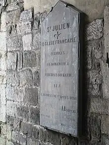 St. Julien's Church on Winkle Street in Southampton was the chapel of the Hospital of St. Julien or God's House which was founded c. 1197 as an almshouse and hostel for travellers on pilgrimage to Canterbury. It was used regularly by French Protestants from the 16th century until 1939 and is thus also known as the French Church. The church is sometimes referred to as "St Julian's" but Southampton City Council's Heritage Environment Record clarifies that "St Julien's" is the correct spelling, which is also used on Ordnance Survey maps.[1]