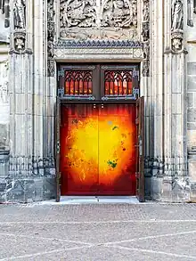 Statues of the Four Evangelists were installed around the main west door in 1911[6] – the figure of John has the face of Friedrich Schiller and that of Luke of Johann Wolfgang von Goethe, marking the Geheime Rat's visit to Münster in 1792.[7] One pillar of the octagonal tower, the roof and the eastern vaulting were destroyed during World War Two. The church hosted two of the three 1941 sermons by bishop Clemens August Graf von Galen against the Nazi Aktion T4 – he had been its parish priest from 1929 to 1933. In June 1942 the bells were taken down. A temporary roof was installed in 1946 and all the war damage had been repaired by 1959. The roof was replaced at its higher late medieval level rather than the heavily articulated neo-Gothic ceiling and the sacristy was rebuilt in the modern style, but otherwise, the lost portions were rebuilt as they had been pre-war, following the 19th-century rebuilding by Hans Ostermann. The main west door has not been opened since a light-installation from 31 October to 1 November 2017.[6] In 2022 the southern door and main entrance was renovated by installing the glass artwork "L'Or" by René Blättermann. Also since 2022 a light installation by Billie Thanner called "Himmelsleiter" is exhibited hanging above the baptismal fountain and on the outside of the large gothic revival tower.