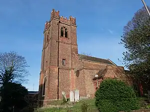Records suggest that a church dedicated to St Luke existed on the site around 1077. It was rebuilt in 1630 with funds provided by Sir Adam Newton, of Charlton House.[1] The coat of arms of one of Newton's executors, the Scottish courtier David Cunningham of Auchenharvie is displayed on the pulpit.[2] The 1630s work, constructed of Kentish red brick, forms the core of the present building, which is Grade II* listed. It was modified in the 17th century, again in 1840 and finally in 1956. Remnants of chalk and flint walls have been found and may relate to the original building.[3]