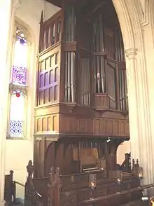Until 1890 the organ sat in a gallery at the west end. It comprised two manuals and 14 stops.[9] The current organ is by Bevington and it was dedicated on 23 May 1890.[10] At the dedication service at 11.00am Haydn Keeton, the organist of Peterborough Cathedral, presided at the organ. Haydon Hare gave a recital in the afternoon on the same day. A specification of the organ can be found on the National Pipe Organ Register.