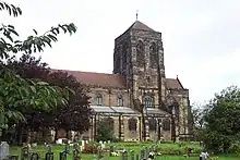 (...) on an aisled, cruciform plan with a massive crossing tower. Built externally of Stanton stone and internally of Runcorn stone, it has a short chancel, a four-bayed nave, and north and south aisles, each with a porch at the west end. There is a chapel at the east end of the south aisle and two vestries along the north side of the chancel, one of them used in 1999 as a parish office and the other as a meeting room. The nave arcades and chancel arch are chamfered with moulded capitals on polygonal piers, and the nave and chancel ceilings have painted wooden panels. The church retains most of its original decorations and fittings: wooden rood screen and choir stalls carved in a mixed Arts and Crafts-Perpendicular style by J. E. Knox of Kennington; chancel floor inlaid with black and white marble; stone side-chapel arch carved by Robert Bridgeman of Lichfield; octagonal font of Frosterley Marble with elaborate wooden canopy, also carved by Knox; stained glass by Sir William Richmond in the east window of the chancel and in the south window of the side chapel; and altar fittings by William Morris. Most of the early 20th-century memorial windows in the aisles come from the Whitefriars studio in London. A bell was taken from the 1838 church for use as a call bell, and a further three bells installed in 1897 were recast as six in 1960.[1]