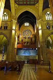 • In 1997 a new pipe organ was built by Orgues Létourneau of Saint Hyacinthe, Quebec, and installed on a new gallery built around the rose window in the western transept. It was completed in 1999 and dedicated by Cardinal Clancy. The Létourneau organ is of three manuals and 46 stops. In addition to being played from the gallery, it may be played with the Whitehouse organ, from a four-manual mobile electronic console located at floor level. This console also controls the Whitehouse organ.