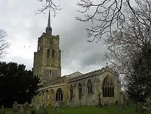 The church dates almost entirely from the 14th century and is renowned for its ornate tower which stands at 176 feet (54 m) and which is crowned by an octagonal lantern with a leaded flèche or spire. The church also contains some medieval graffiti carved on its walls which highlights the plight of survivors of the bubonic plague pandemic known as the Black Death. The church has been Grade I listed since 1968.[4]
