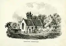There were further restorations in 1858, 1865 and 1871.[1] In 1858, the upper part of the west wall was rebuilt and a two-light window inserted. In 1865, the interior was re-ordered and the box pews cut down. In 1871, the bell-turret was replaced by a bellcote.[14] Either then or subsequently the tiled and thatched roofs were re-done in slate, and this was first noted in 1903. The demolished north vestry was rebuilt, and the old south porch vestry demolished in lieu.[15]