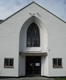 St. Mary's Church became one of the first postwar churches to gain listed status,[12] and it has been praised for the "sculptural quality of its interior" and its "attractive" Perpendicular Gothic Revival form "refined by Maufe in a very personal way".[9] Describing the style as "quintessential Maufe" featuring "the most distinctive elements of his personal style", architectural historian Elain Harwood called it "one of his most charming designs".[11] The style is a simplified, unadorned interpretation of Perpendicular Gothic Revival with elements of the domestic Vernacular style—in particular in the treatment of the wood-framed nave windows.[6][9] The plan comprises a nave with north and south aisles supported by buttresses, a chancel and sanctuary with an apsidal end, a bellcote at the northwest corner, a Lady chapel and an axially placed tower—an unusual style for Maufe—at the east end. The brick walls are painted white.[6][9][11] The wide tower and the church's position on a low hill next to the park make it stand out from the surrounding houses.[11] The roof has a shallow pitch and is laid with red pantiles. The tower, which has the memorial clock on one side, has two pointed-arched openings on each face. The straight-headed entrance is at the west end, set beneath an arch with decorative moulding. A large simplified lancet window is set into the pointed-arched recess above this.[9]