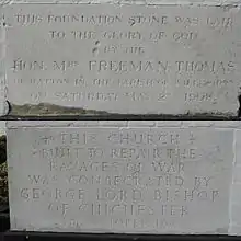 The foundation stone of the original church survives, and is set in the wall near the new foundation stone laid in 1953.