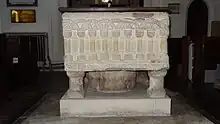 The church may date to Anglo-Saxon England. A spurious charter of "959" records the rectory as being owned by Westminster Abbey, and a priest is mentioned in 1086 in the Domesday Book, strongly implying the existence of a church, which was separately documented six years earlier. Associated archaeology has found near-certain Anglo-Saxon burials. The first definite date is the church built around 1080, and a Norman font (pictured below right) is still in use.[2][3] The building has a thirteenth-century nave, chapel, north aisle and south arcade, together with traces of painting on the walls. The fifteenth and sixteenth centuries saw further rebuilding – the tower and south arcade reflect this phase.[4]