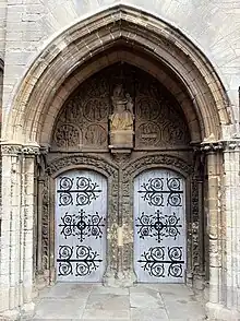 The west front of the tower is little short of sensational, a gallery of medieval decoration attributed to French masons from Westminster. The twin doors are framed with carvings and a Tree of Jesse rising from a central shaft. The unusual roundels in the tympanum, based on illuminated manuscripts, are of New Testament scenes. Sculpture dots each front, including on the north a charming man making music while locked in the stocks. Some of the niches have excellent modern statues in them.[3]