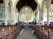 Inside the church are tall five-bay arcades with pointed arches carried on quatrefoil piers. The hammerbeam roof in the nave dates from the 15th century, and is in ten bays. The chancel roof dates from the 19th century, and has six bays. The 16th-century vestry roof has a large central pendant. In the south wall of the chancel is a piscina and an elaborate triple sedilia. The sedilia is in Perpendicular style, and has canted canopies with lierne vaulting. There is another piscina in the south aisle. The north aisle contains a 14th-century octagonal font. On the wall of the aisle is a re-set section of a reredos dated 1709, an 18th-century painting of the Holy Family, and elaborately decorated boards inscribed with the Ten Commandments. The Commandments occupy two central panels, and are flanked by panels containing paintings of Moses and Aaron. On the floor beneath these objects is a long school desk carved with graffiti, and a 19th-century bier. Over the south doorway are the Royal Arms of Charles II in an oval frame. In the nave is a 15th-century iron-bound chest. The seating, the Gothic-style pulpit and the brass lectern all date from the 19th century. The stained glass in the east window is by T. Farrow of Diss, and is dated 1853. The glass in the aisles is from a later date.[1]