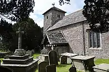 The Monmouthshire antiquarian Sir Joseph Bradney records the gift of the advowson of Tregare from "John de Hastings to the see of Llandaff" in 1285.[1] The present church dates from the 14th century,[2] the style a mixture of Decorated Gothic and Perpendicular.[3] The church is built of sandstone rubble, with slate roofs.[2] It comprises a small nave, an "unusual" [4] South porch, a chancel and a West tower, of slightly later date than the church.[2] The tower, with a pyramid roof [4] and cockerel weathervane, is a notable feature.[3] The church was restored by the Cardiff-based architect G.E.Halliday[5] in 1900.[4]
