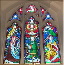 Inside the church, the high altar and reredos date from 1865, and were probably designed by E. W. Pugin. They were separated in 1948–50 by Weightman and Bullen, who placed the reredos against the east wall. The stained glass in the east window dates from 1878, and is a typical design by the Belgian stained glass painter Jean-Baptiste Capronnier.[3] The two-manual pipe organ was built by Franklin Lloyd in 1895, and is situated in a gallery on the north wall of the church at the west end.[6]