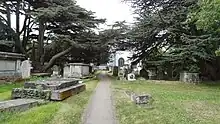 The churchyard is well maintained,[4] and it has many tombs and memorials in the grass, which is kept long in parts. There are fine cedar and yew trees.[3] A line of headstones on either side of the path lead to the church door, and they form part of the best collection of eighteenth century headstones in London. Burials go back seven to eight hundred years, and as a result the soil contains fragments of bone. Part of it is gravelled, which is unusual in Christian graveyards. It is still open for cremation burials.[4]