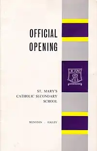 The original buildings, to which pupils were admitted in November 1964, were officially blessed and opened by George Dwyer, Roman Catholic Bishop of Leeds on 3 July 1965. The first chairman of governors, who presided was E. Malone. St Mary's opening led to a reorganisation of Catholic schools in the area, as they became primary schools.[8] The school colours of purple, yellow and grey have remained unchanged since the opening.