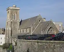 The plans provided for a tower and a large spire. The latter was never added, but in 1872 a tower was built at the southwest corner.[1][15][16] Other work carried out in this year included the addition of an organ chamber (in the form of an apse) and a vestry, and a new east window in the chancel.[16] Stained glass windows by Morris & Co. were added in 1882. A church hall, a simple brick structure, was built on the northwest side in 1935.[1]