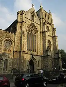 The construction of the original building began in 1851 to original designs by Thomas Meyer in the Puginian Gothic style. Meyers also built, around the same time, St Joseph's Church in Avon Dassett, Warwickshire.[3] Work was temporarily interrupted due to lack of funds, but was completed in 1857 by Manning's kinsman Henry Clutton, with additions by John Francis Bentley.[4] Meyer also designed an earlier school chapel, also on Moorhouse Road.[5] The church was initially dedicated to St Helen, in honour of Helen Hargrave, a benefactor.[6]