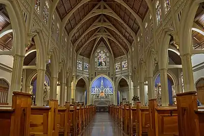 The church was closed following the July 2013 Seddon earthquake and the August 2013 Lake Grassmere earthquake sequence for structural strengthening. The church had been assessed as being between 15%–20% of the standard a new building would be built to. In New Zealand, buildings assessed as below 33% of standard are considered "earthquake prone" and strengthening is required or a compulsory demolition can be ordered. The church re-opened in April 2017 after earthquake strengthening to 100% of code, costing $9.5 million, collected in a well-supported public fund-raising campaign. The look of the interior was largely unchanged except for the shear walls built in two locations on each side of the church near the entrance, and beside the sanctuary. All the ornate columns supporting the roof, the foundations and the copper and slate roof were replaced. Certain clerestory stained glass windows were obstructed from view on the outside of the church by the new shear walls but inside were unchanged, with the images illuminated as through the other windows, by means of artificial lighting. The effect of the seismic strengthening was generally perceived to be a restoration rather than a reconstruction, although the latter was the true situation.[13] [14] The project was undertaken by Clendon Burns & Park as the engineer and LT McGuinness as the construction company and was awarded a heritage restoration award in the 2018 New Zealand Heritage Project Awards.[15]
