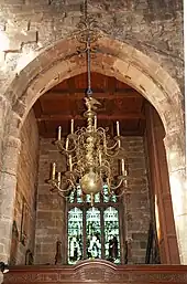 Over the nave near the tower is an 18th-century brass chandelier, "a cut above the norm" according to Pevsner, which was retained from the old church and converted to electricity.[10][15]