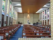 The floors are finished with a pale green vinyl tile; however, much of the nave floor has been covered with a dark blue carpet. The floor of the sanctuary was finished with a cream marbled tile, which has also been covered with a cream carpet.[1]