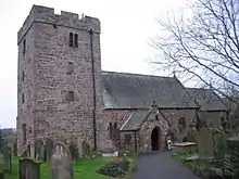 The church is constructed in sandstone with green slate roofs.[2] The foundations incorporate stones from former Roman buildings.[3] Its plan consists of a three-bay nave with a north aisle and south porch, and a two-bay chancel at a lower level. At the west end is a square tower in three storeys. It has a two-light west window and two-light bell openings, and other small windows on each face.[2] It is possible that this was a pele tower.[3] The roofs have coped gables and cross finials. In the nave and the aisle the windows date from the 19th century, while the windows in the chancel are original; also in the chancel is a priest's doorway. Medieval graveslabs are built into the wall of the aisle.[2][5]